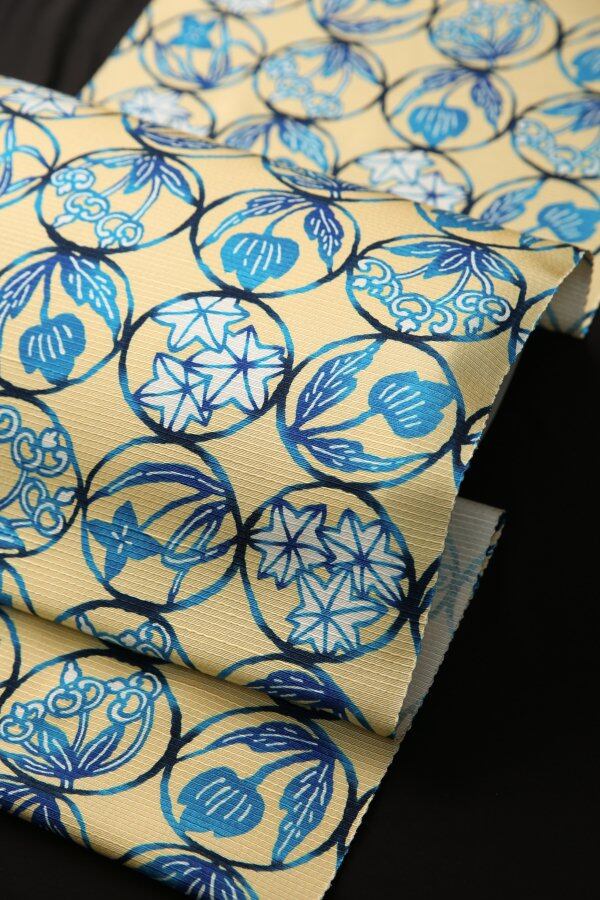 浜つむぎの独特の地風が、締め心地を楽しませてくれます。おしゃれ丸紋柄が、ブルーを基調にして手描き調に配列した楽しい柄行きの一点です。
