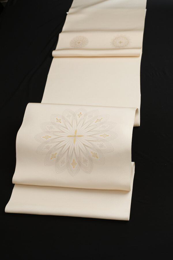 アイボリー系の地色に金彩のみで描きあげた品の良い帯です。