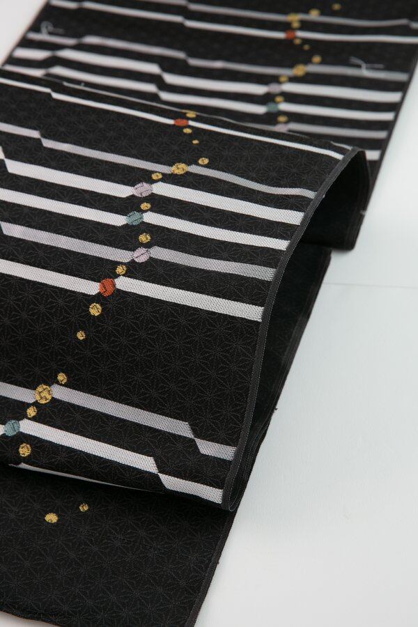 スミ色の地色に麻の葉模様、柄は線調子とドットで古典と現代風を融合した
