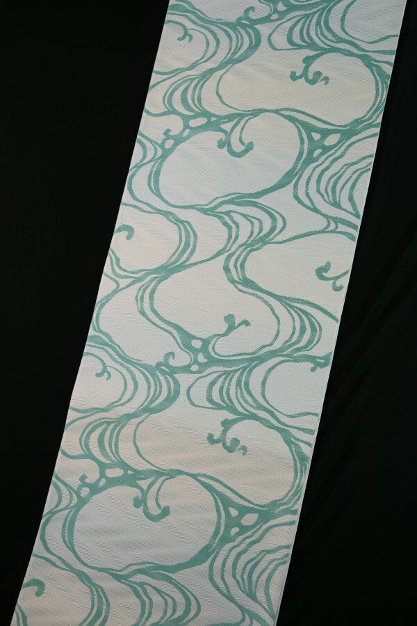水面を思わす織地にエメラルドグリーンで表した流水の柄が心を洗ってくれるような優しい気分に