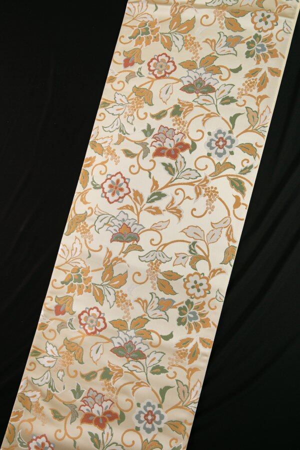 クリームの織地に人気のある唐草花模様。無難に合わせやすい柄です。